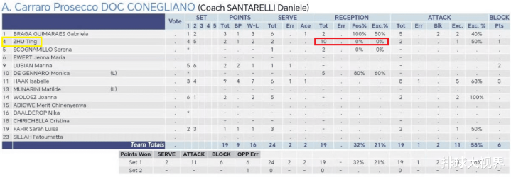 Zhu Ting was targeted with serves throughout the match. In the first set, she received 10 serves, with a 0% accuracy rate… Overall, she received 27 serves, with a 30% accuracy rate and a 15% perfect reception rate.